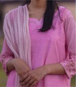 Chic pink top adorned with delicate lacework on the sleeves, borders, and a buttoned collar neckline, enhanced with frilled detailing for a feminine touch. Paired with a lace-trimmed shalwar and a beautifully pleated chunnat dupatta, this ensemble blends elegance with charm.